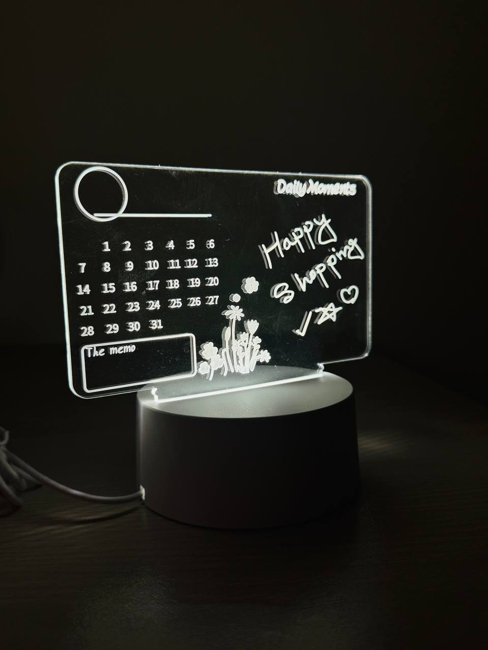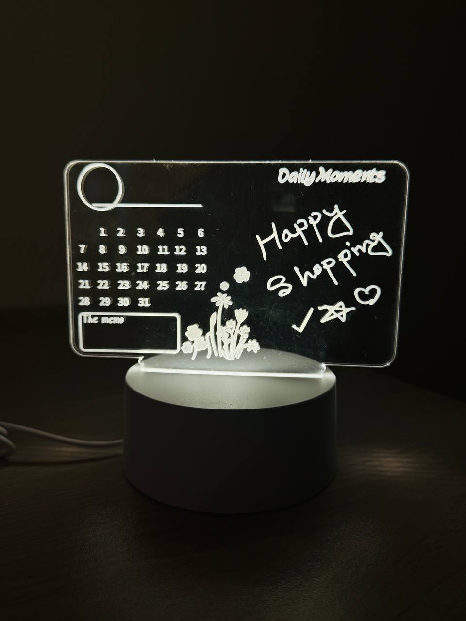 ল্যাম্পটির ওপর ক্যালেন্ডার বা টু-ডু লিস্ট লিখে রাখা যায়, যা সহজে মুছে ফেলা যায়। LED ব্যাকলাইটের মাধ্যমে রাতেও স্পষ্ট দেখা যায়।