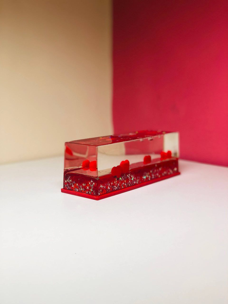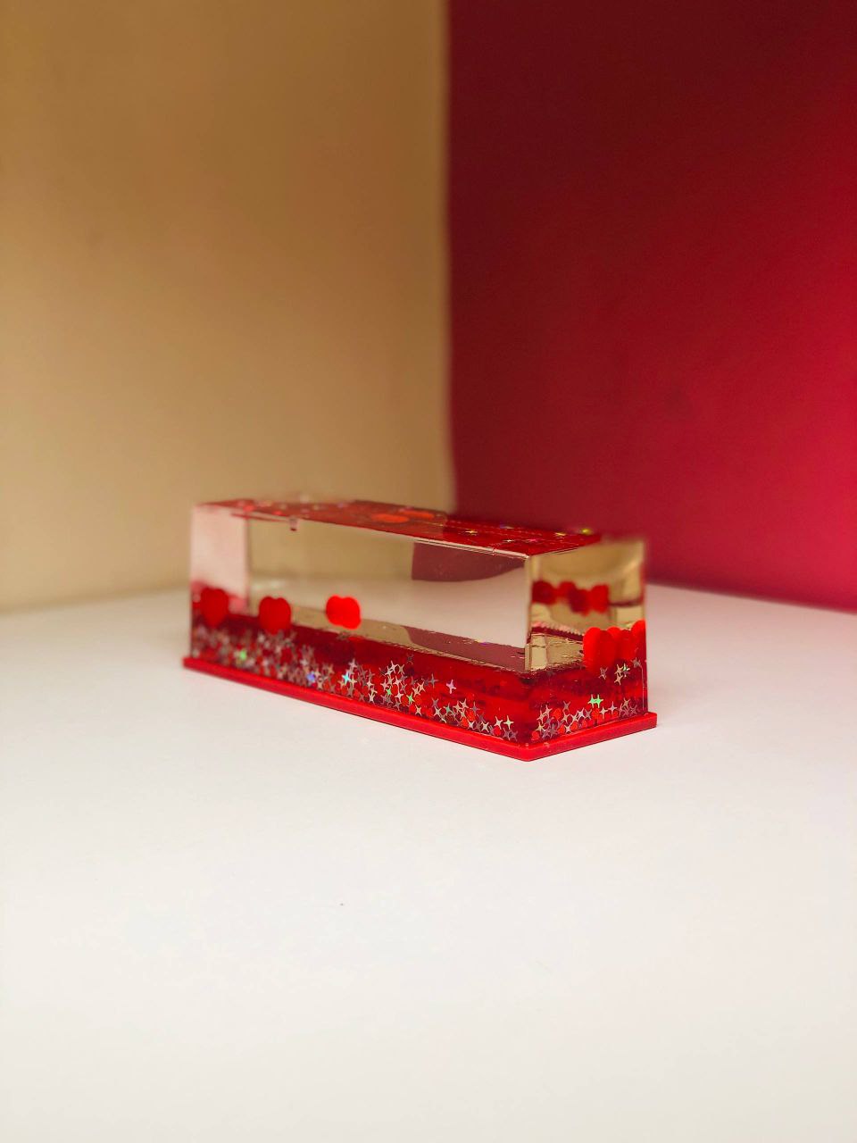এই সুন্দর টি একটি রোমান্টিক ও আকর্ষণীয় টেবিল ডেকোর, যেখানে স্বচ্ছ অ্যাক্রিলিক বক্সের ভিতর লাল হার্টগুলো ভাসমান অবস্থায় থাকে। বক্সটি আলতো করে নড়ালেই হার্টগুলো ধীরে ধীরে উপরে নিচে ভেসে নরম মুভমেন্ট তৈরি করে—যা দেখতে খুবই soothing এবং aesthetic।